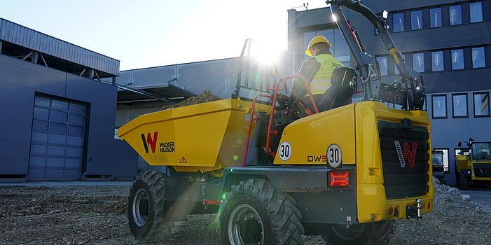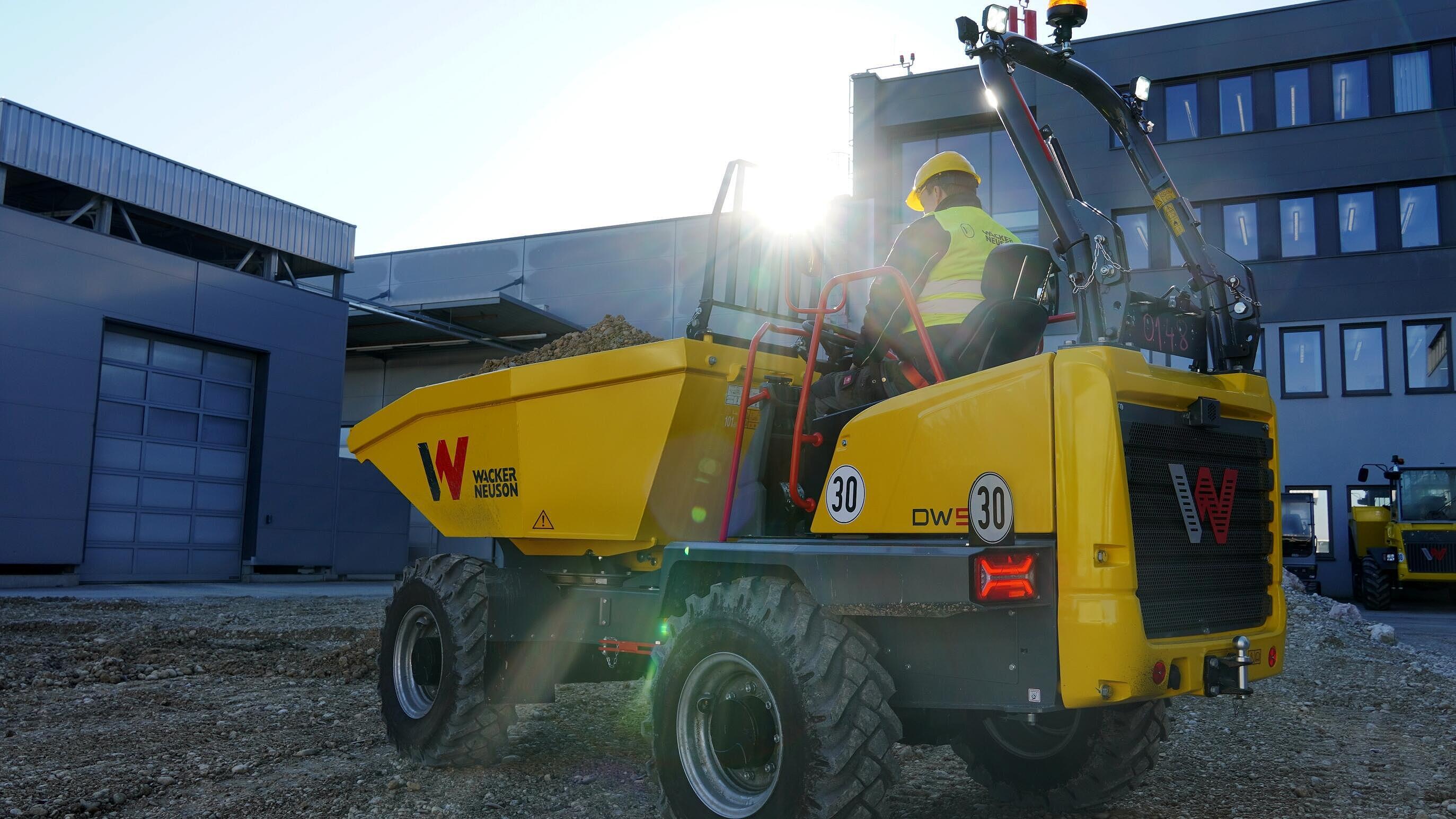 The wheel dumper DW50 has been optimized for safety, performance and comfort. A variety of new details make the machine the safe helper in material transport: the hill hold function prevents the machine from rolling back when stopped on a slope. Also, seat belt monitoring means the operator must first fasten the seat belt to be able to start the machine. An optimized skip format for more volume and a minimized risk of damage when loading with an excavator bucket. Moreover, the machine has overfilling protection, seat heating, and cruise control as well as a large, clear display, safety features such as cameras in both travel directions, and rear LED lights with dynamic turn signals. Other features of the machine are, for example, the standard auto-stop function: this shuts the machine off automatically after a predefined period of time when not in use. At the same time, electric consumers that are not safety-relevant are also switched off to conserve the machine’s battery. The advantages: operating costs are reduced, maintenance intervals become longer, and the resale value of the machine is accordingly higher. The time-tested and proven hydrostatic 4-wheel drive ensures that the machine evenly accelerates up to 30 km/h.